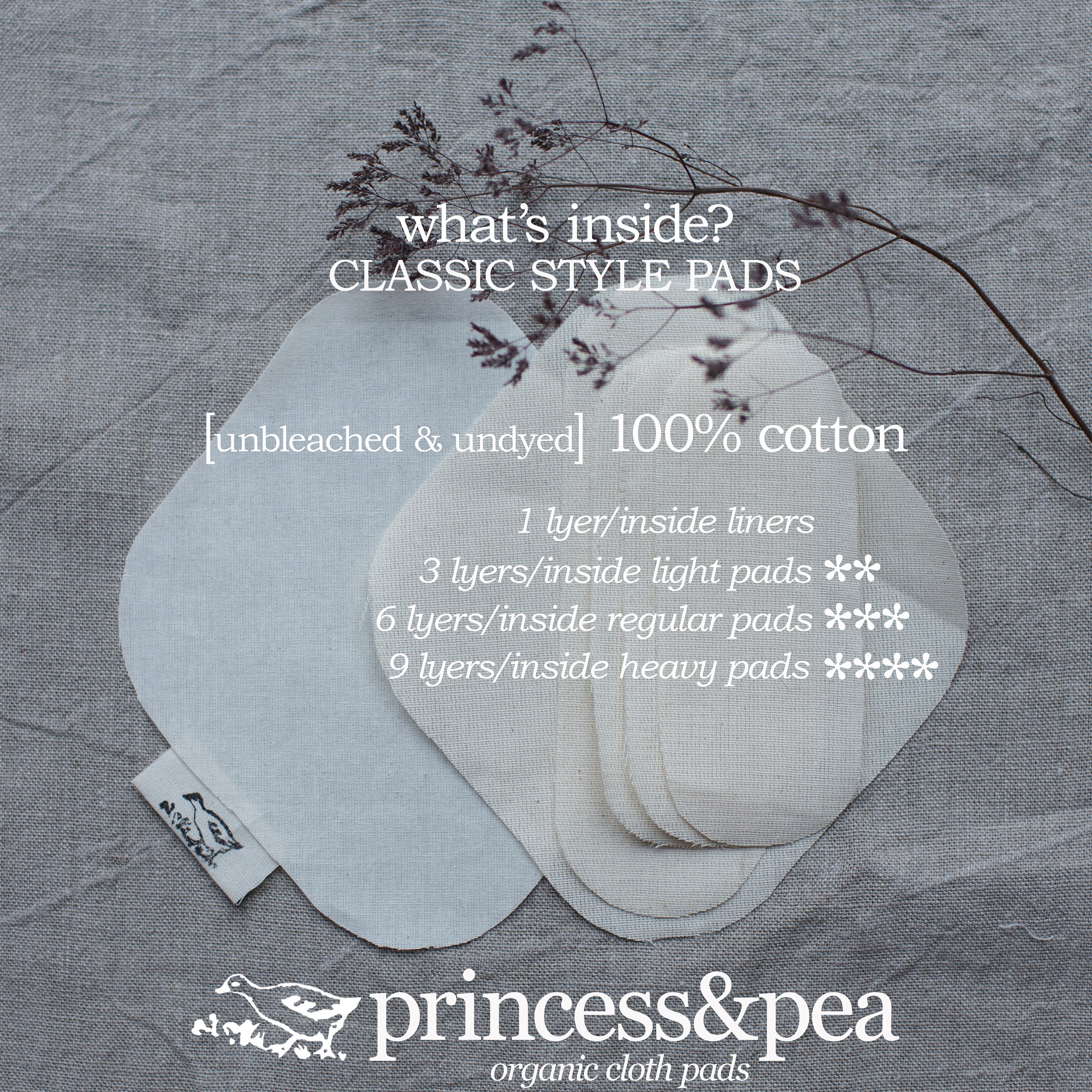 ** Light: A very compact, basic pad, for light flow, for the first and last days of period. ( CORE: 3 layers of loose woven cotton inside for absorbency; TOP: 1 layer loose woven cotton, 1 layer thick woven cotton)